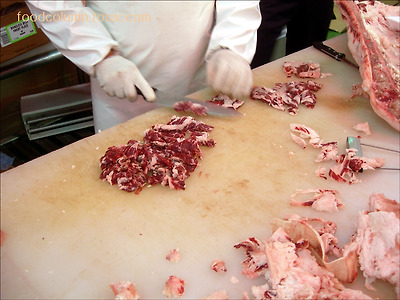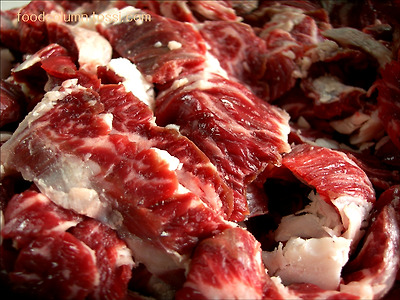 △소 한마리에서 나오는 안창살의 양은 불과 1.5kg에 불과하다. 소 반마리에서 나온 안창살을 얇게 썰고 있다