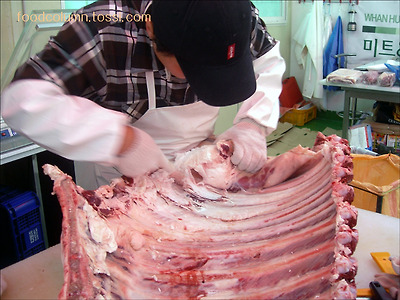△횡경막(안창살)을 떼 내는 작업을 하고 있다