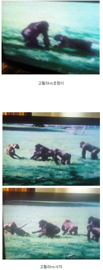 그리고 과거에 중국의 한 동물원에서는 시베리아호랑이 4마리+북극곰3마리(7마리 모두 다자란 수컷)를 롤랜드고릴라 5마리(수컷 4마리+암컷 1마리)가 있는 우리 안에 넣어주었던 적도 있었습니다. 결과는 3분도 안있어서 호랑이와 북극곰들은 7마리 모두 고릴라 무리에 의해 무참히 잡아먹혀 결국 뼈 몇조각만 남기고 모두 사라졌다고 합니다.