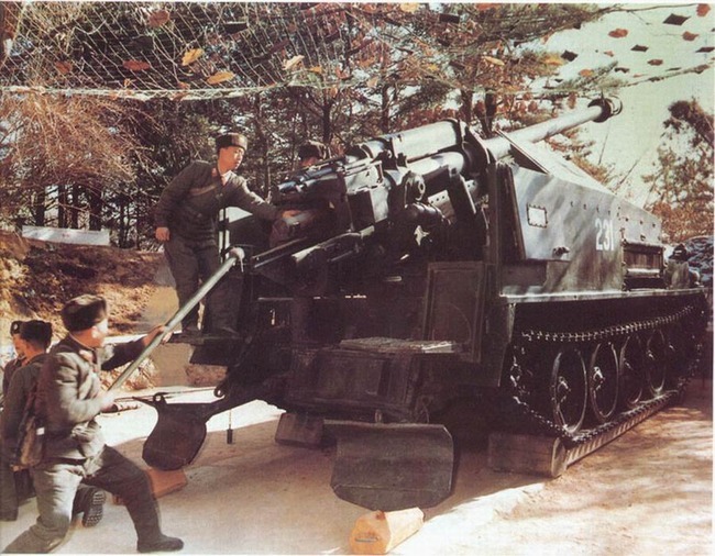 북한 170밀리 자주포... 역시 차량위에 포만 덩그러니 올려놓음... 주변에 포탄이 낙하하면