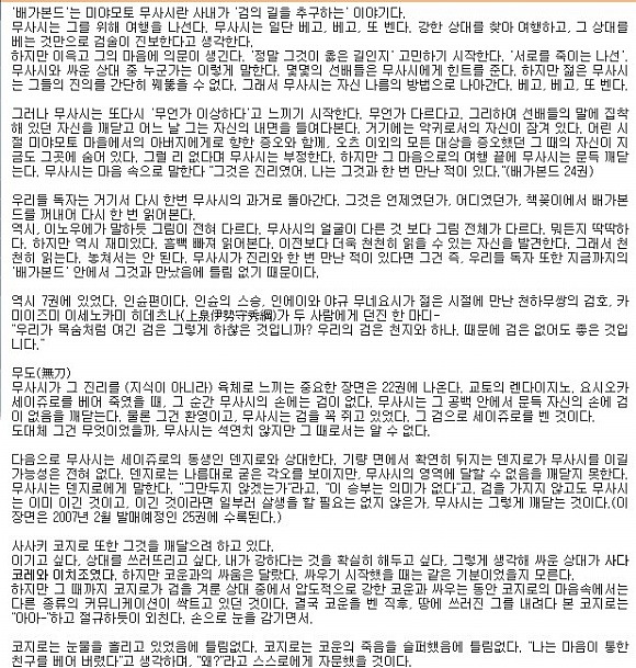 작성자BIGJT 작성시간 12.05.21 무사시이야기가 구전이다보니 시대와 작가에따라 구성이 달라지는 면이 있는데... 바다를 등지고기다리는 코지로를 이길수 없어서 바다로 들어가 뺑~ 돌아서 등을 쳤다는 결말이 유명한데 그런식으로 끝낼꺼같진 않습니다ㅎ;;; 설마~