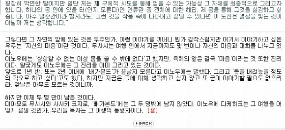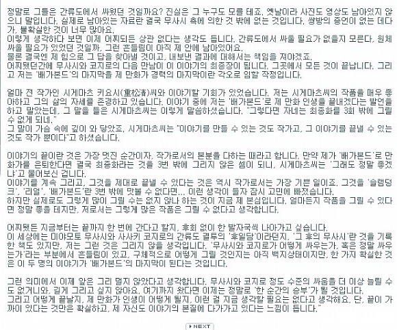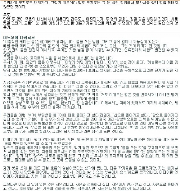 작성자The Kobe 작성시간 12.05.22 마지막 '몸을 쓰는 것'에 관한 이야기에서 슬램덩크의 마지막 부분이 생각나는군요. 언어 적이지 않은 것을 통한 표현 능력은 이 작가를 따라갈 사람이 없지 않나 합니다. 마지막에 서태웅과 강백호가 하이파이브를 하는 장면은... 그림, 구성, 그림의 내용 컷트를 나누는 방법 등등을 통해 말 한마디 없이 슬램덩크를 완벽하게 마무리 시켜주었죠. 이번에도 이노우에가 그런 완결을 할 수 있을 지. 기대됩니다.