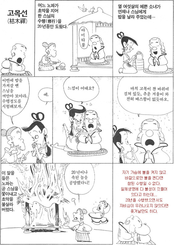 저 스님이 '나는 마음의 변화가 없다.' 라고 했는데 그것이 '실제로 나는 20년간 수행을 해와서 여자가 가까이 와도 이젠 마음이 차갑다.' 라면 인간 본성을 잃어버린(자기 마음에 불을 켜지 못하는) 것이니 헛수행을 한 것이요, '내 마음에 변화가 있는 데 없다고 거짓을 말했다.' 라면 역시 20년간 수행해도 자신의 마음 하나 다스리지 못했으니 헛수행한 것이다. 라고 말하는게 아닐까 싶네요.