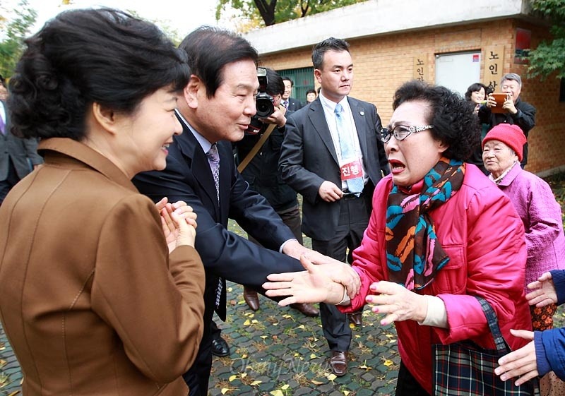 ▲ '손' 숨기는 박근혜 후보 - 박근혜 새누리당 대선후보가 5일 오후 서울 용산구 대한노인회 중앙회에서 한 지지자가 울음을 터뜨리며 다가와 손을 잡으려 하자 "손이 아프다"며 손을 등뒤로 숨기고 있다. ⓒ 권우성