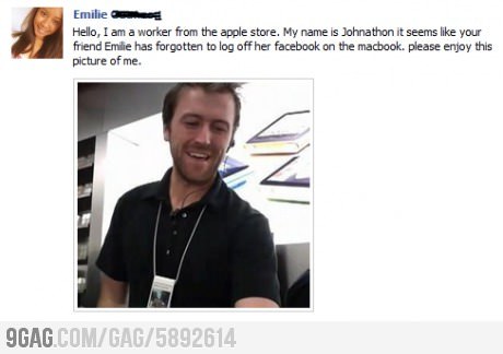 "안녕 난 애플스토어 직원임. 내이름은 조나단이고 니네친구 에밀리가 맥북에 페북 로그오프하는거 잊어먹은듯함. 내사진이나 감상하셈."
