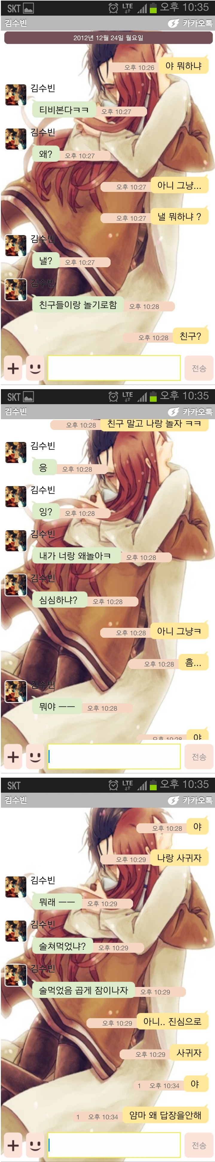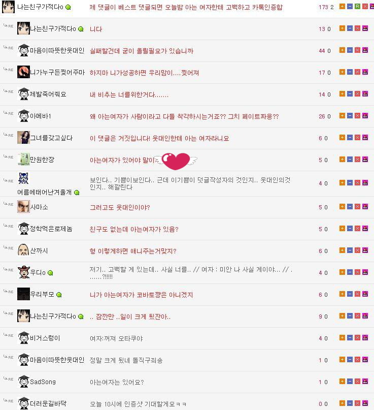 작성자Bryant for the win 작성시간 12.12.28 아니 이게 세상에 당치도 않은 소립니다. 아니 참나 이게 지금 말이 되는 소리라고 생각하십니까? 푸핫 커플이라니 커플이라니요. 저런 거를 하나하나 인터넷에 올리는 것을 보니 이거야말로 실소를 금할 수가 없군요. 제발 이상적인 얘기는 그만두고 다들 현실을 직시하시길. 아니 참나.