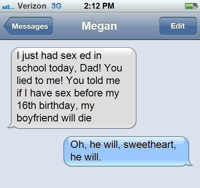 딸 : 오늘 학교에서 성교육 받았어요. 아빠! 저한태 거짓말했어요! 제가 16살 전에 성관계를 하면 남자친구는 죽는 다면서요?!