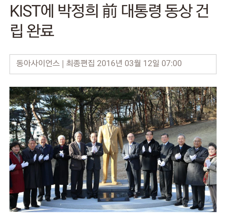 한국과학기술연구원(KIST)은 11일 오후 4시 서울 성북구 화랑로 본원에서 박정희 전(前) 대통령의 동상 제막식을 열고 동상을 처음 공개했다. 동상 제막에 이어 박 전 대통령이 생전에 좋아했던 이팝나무를 심는 식수 행사도 이어졌다.