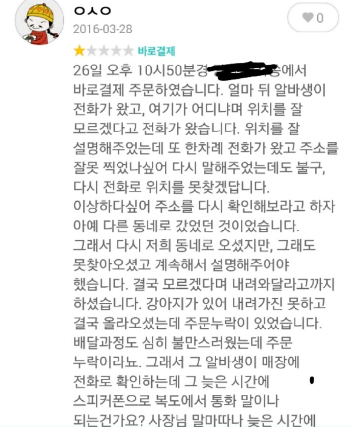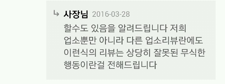 작성자badman 작성시간 16.04.07 리뷰달때 내용도 없이 그냥 별로라고 달면 기분이 나쁠수도 있겠지만 그렇다고 손님한테 법적 대응이니 마니............참........두번째 리뷰처럼 처음부터 세세하게 올렸어도 법적대응하겠다고 할 사람 같네요.