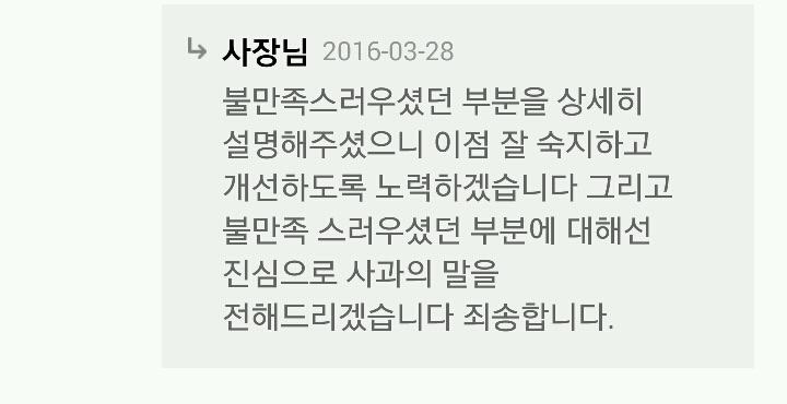 작성자젊은이의돌직구 작성시간 16.04.07 사장님의 댓글도 이해갑니다 이번경우는 판매자쪽이 잘못했습니다만 온라인판매하고있는데 밑도끝도 없이 악성댓글 다는분 엄청 많습니다