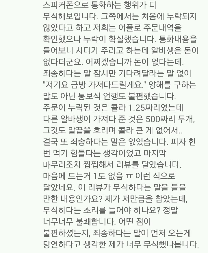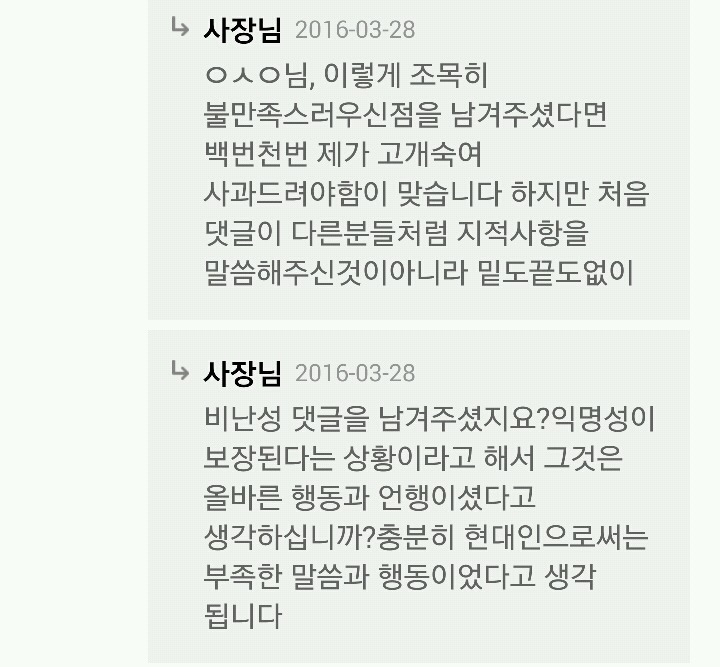 작성자김천박 작성시간 16.04.07 일단 사장이 잘못했고.. 고객입장도 이해가 안가긴 하네요..제 입장에선 딱히 기분 나쁠게 보이질 않네요.