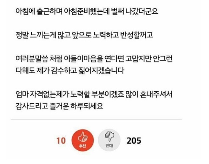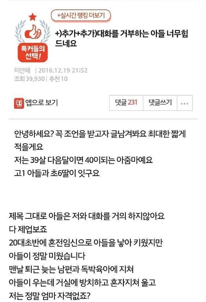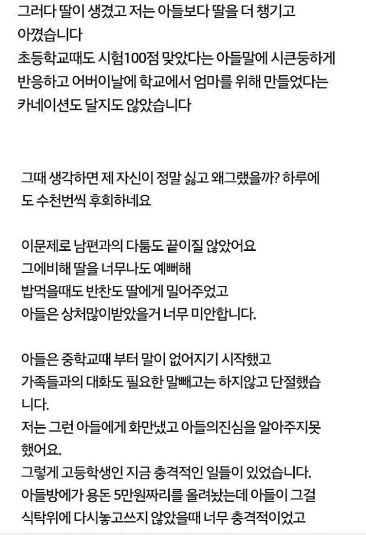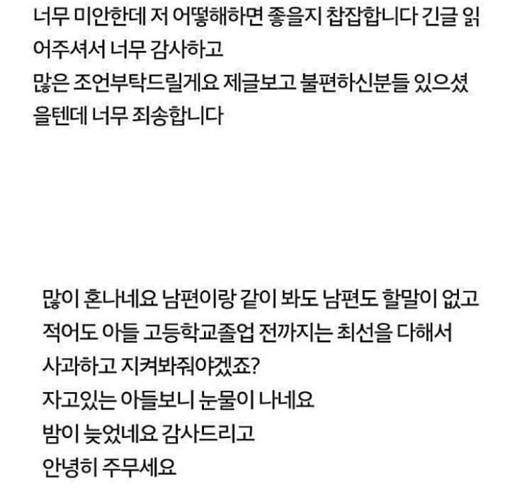 작성자dime 작성시간 18.03.24 안타깝지만 관계회복은 이미 늦었습니다. 크게 엇나가지 않은 아들분이 너무 장합니다.
