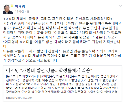 표절 문제로 변명한다는 말이 자신이 시장으로 있는 성남에 위치한 가천대를 이름도 없는 대학이라고 얘기