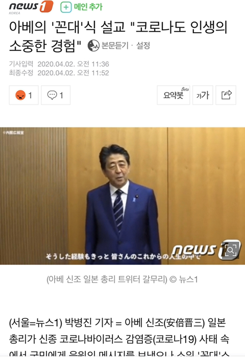 아베의 '꼰대'식 설교 "코로나도 인생의 소중한 경험" 작성자NewType|작성시간20.04.02|조회수1,439 목록 댓글 12 글자크기 작게가 글자크기 크게가 어...어디서 본거 같은데.... 日 아베의 '꼰대'식 설교 (서울=뉴스1) 박병진 기자 = 아베 신조(安倍晋三) 일본 총리가 신종 코로나바이러스 감염증(코로나19) 사태 속에서 국민에게 응원의 메시지를 보냈으나 소위 '꼰대'스러운 발언으로 오히려 빈축을 사고 있다. 2일 트news.naver.com 다음검색 현재 게시글 추가 기능 열기 북마크 공유하기 신고 센터로 신고 댓글 댓글 12 댓글쓰기 답글쓰기 댓글 리스트 작성자드디어국대4번이승현 | 작성시간 20.04.02 김무성 발언 표절 당해...ㅋㅋㅋ 작성자V.CARTER | 작성시간 20.04.02 보고 있나 무성군... 여기 자네를 능가하는 인재가 있네 답댓글 작성자V.CARTER | 작성시간 20.04.02 그것도 둘이나... 이미지 확대 작성자아나킨 | 작성시간 20.04.02 오늘부터 김아베 작성자한참농구재밌을나이 | 작성시간 20.04.02 노룩패스만 하면 완성이네요 댓글 전체보기