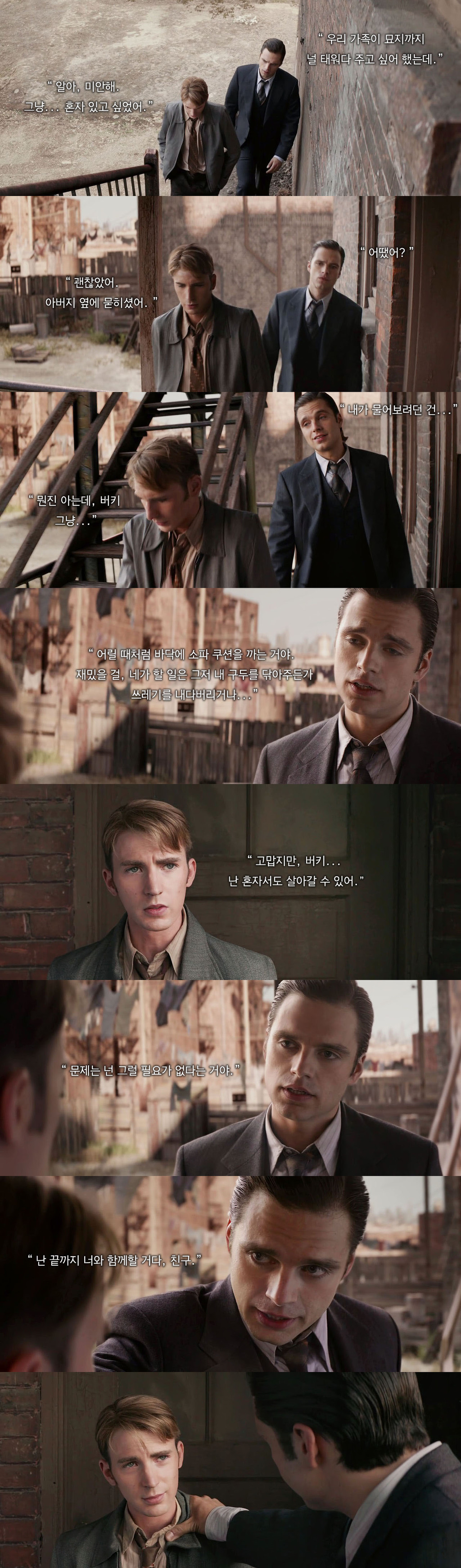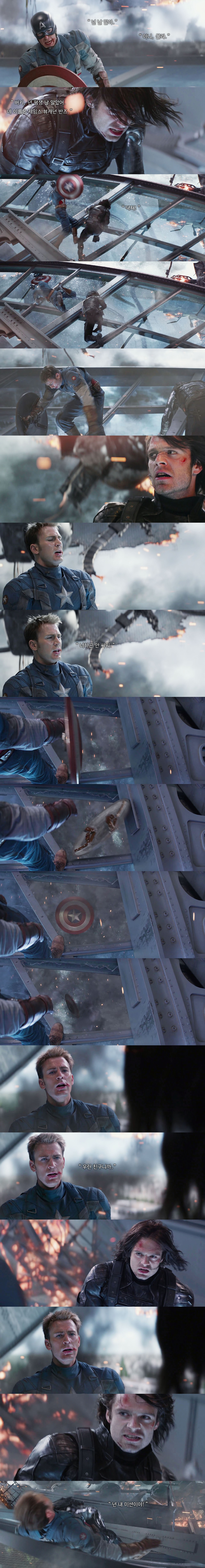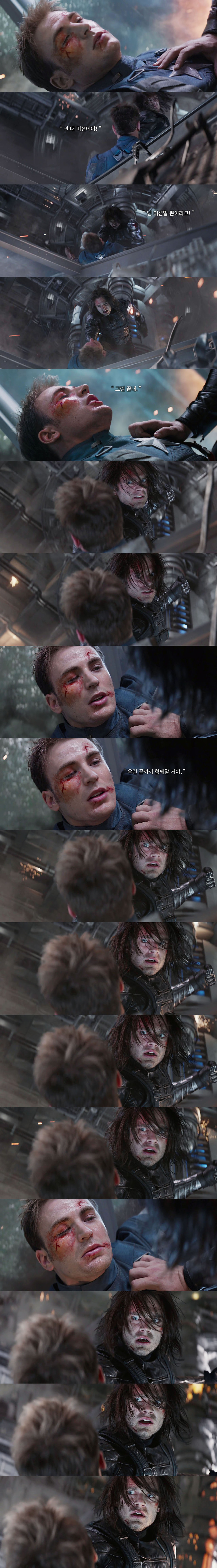 버키가 스티브에게 정말 소중한 존재라는 걸 알 수 있는 장면 중 하나)