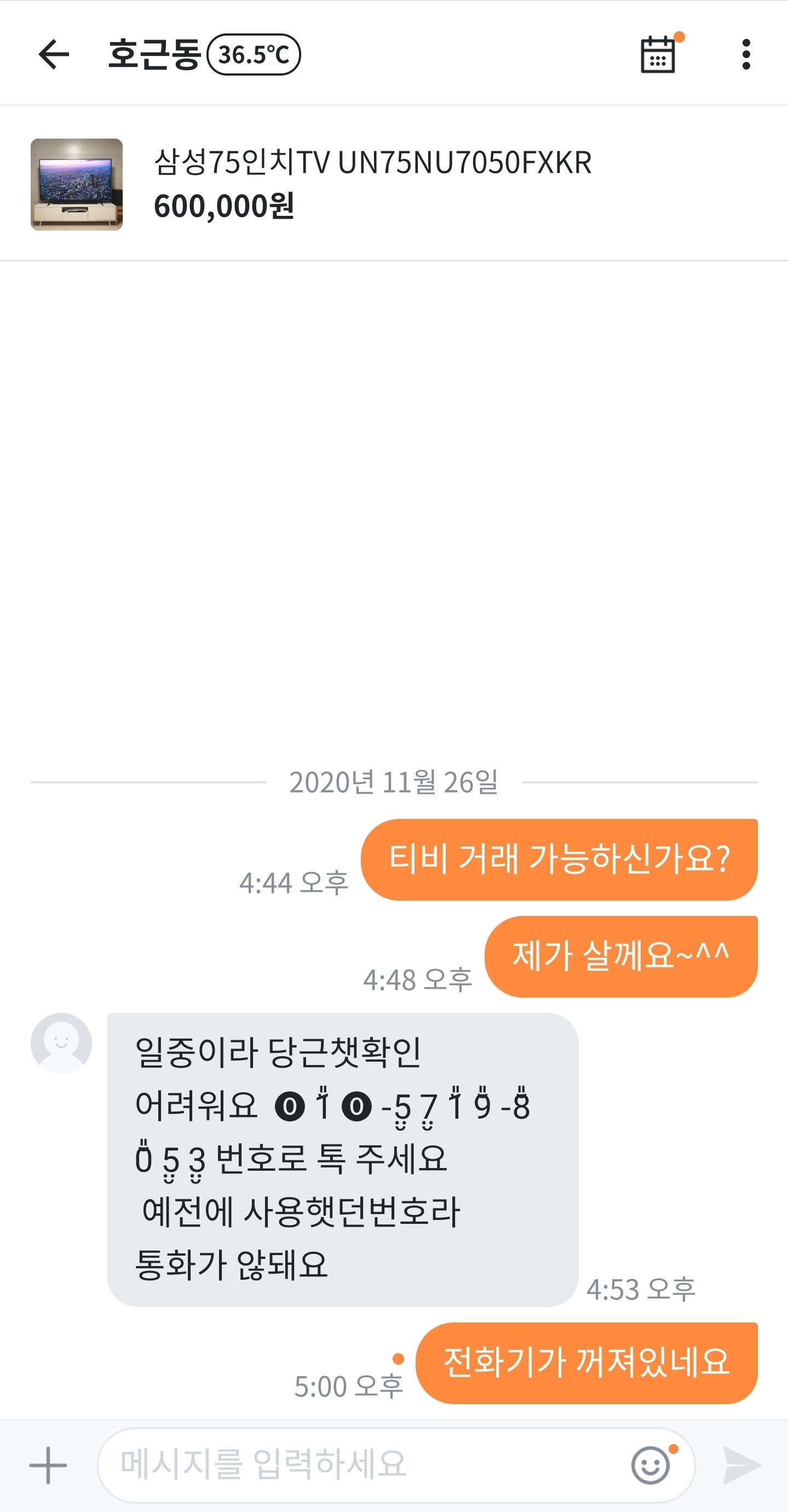 오늘 당근마켓에 판매가 200만원짜리 티비를 60만원에 판다고 올리고 대포폰을 이용해서 사기를 치려는 사람을 발견했네요.