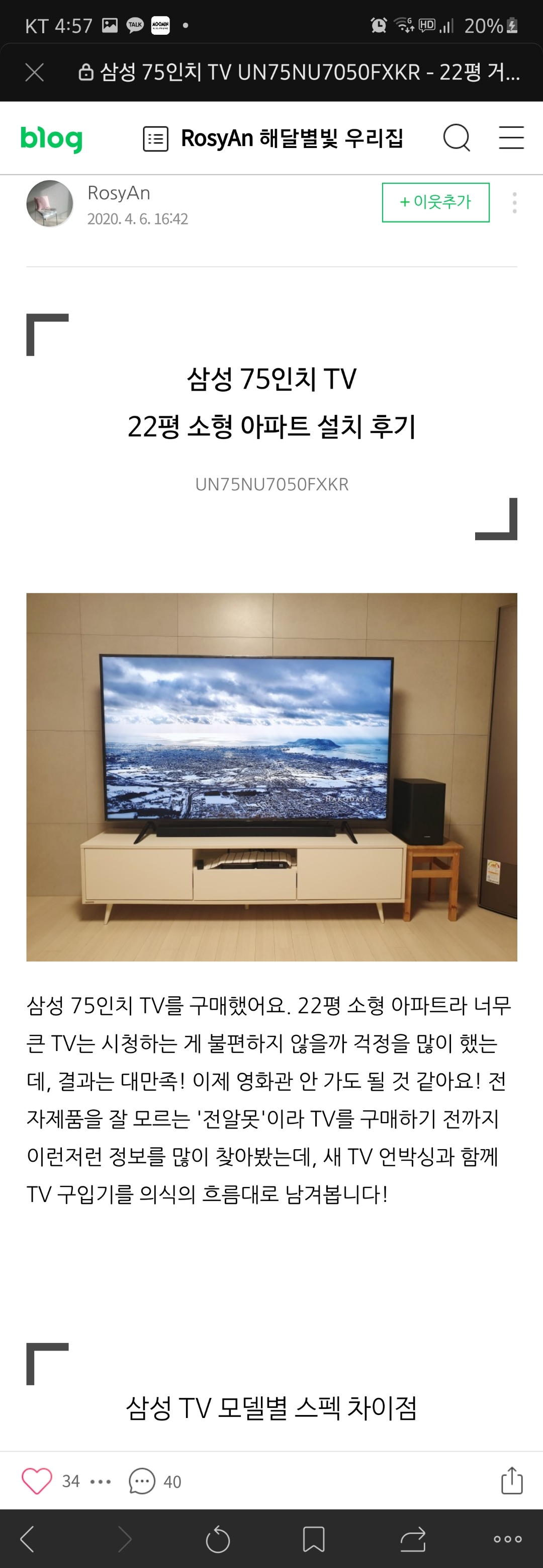 알고보니 2020년에 같은 모델 티비 구입한 다른사람 후기 블로그에서 다운받은 사진을 도용한 후