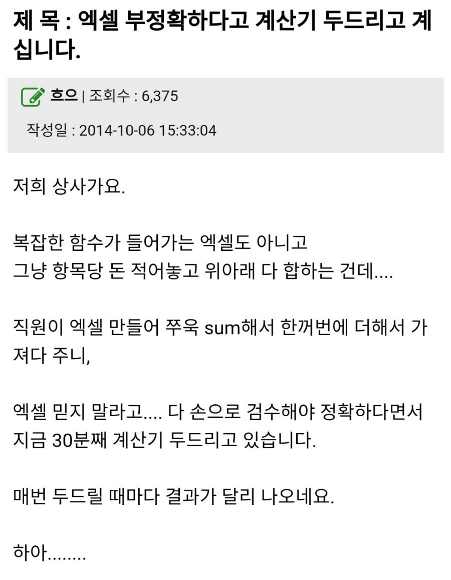 예전에 액셀로 매출 취합 해서 보고 했는데, 본인이 계산기로 계산 하고 틀렸다고 화 내는 사람을 만나 봐서 한번 노트에 다 정리 해서 보고 했죠. 계산기로 더 이상 계산 안 하더군요.