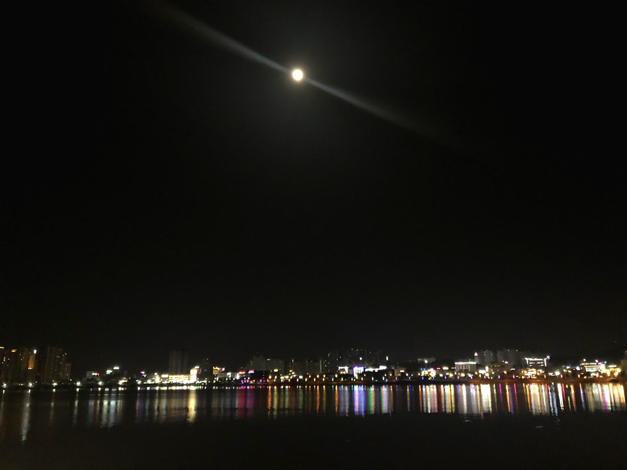 호숫가에 비치는 불빛들과 하늘에 떠있는 달의 조화가 참 아름답워서 몇분동안이나 계속 쳐다보고 있었어요~