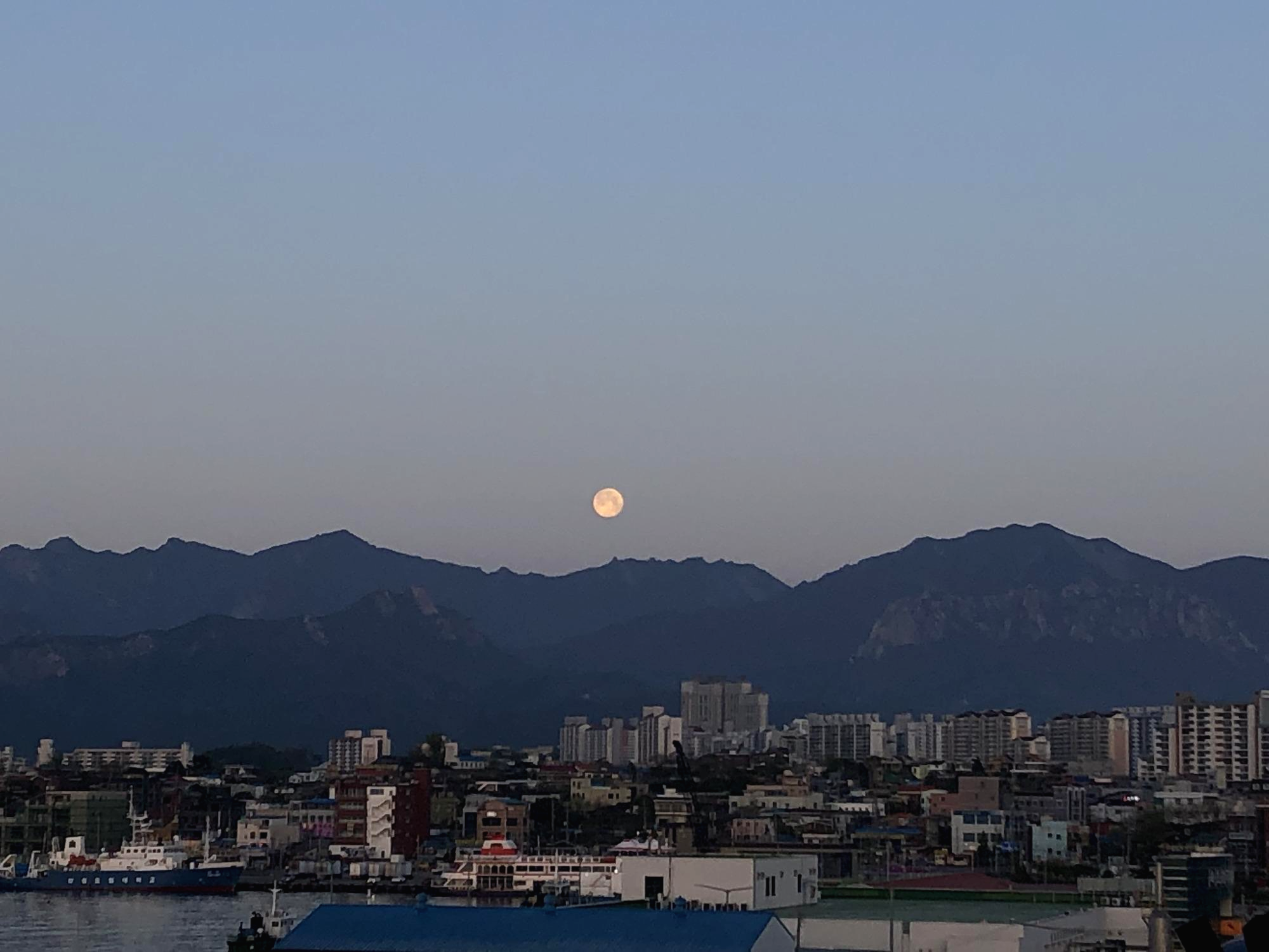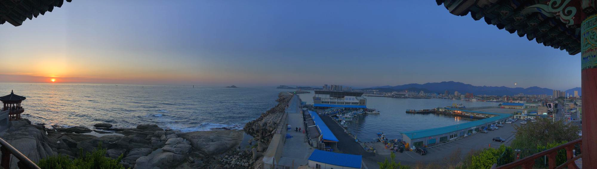 파노라마로 그냥 한컷 찍어봤는데, 우연히 왼쪽 바다 위에서는 태양이 떠오르고 있고, 오른쪽 설악산 위쪽으로는 달이 동그랗게 떠있습니다. 둘다 동시에 찍힌게 신기하네요~