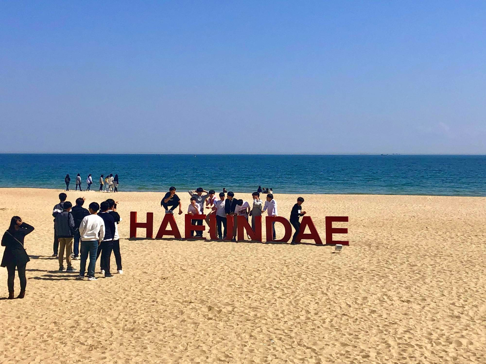 학생들이 해운대 로고 앞에서 재밌게 사진을 찍고 놀고 있네요 ㅎㅎ 저 나이때는 뭘해도 재밌을 나이죠 ㅎㅎㅎ