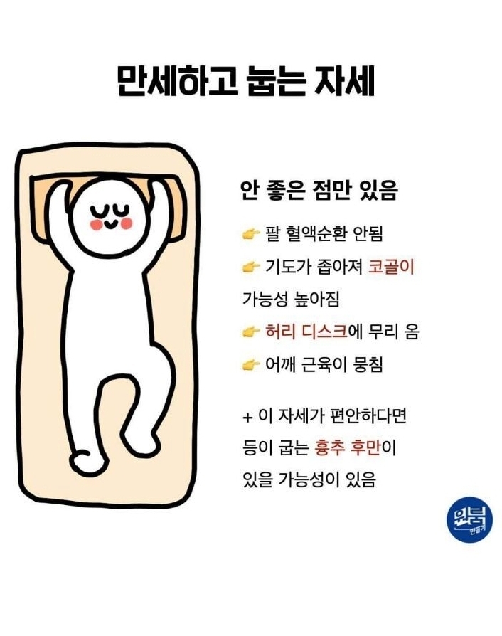 수면자세별 장단점 작성자인생이다그런|작성시간22.04.06|조회수4,000 목록 댓글 11 글자크기 작게가 글자크기 크게가 ㅊㅊ - 움짤저장소 다음검색 현재 게시글 추가 기능 열기 북마크 공유하기 신고 센터로 신고 댓글 댓글 11 댓글쓰기 답글쓰기 댓글 리스트 작성자넌나만의TOP | 작성시간 22.04.06 서서 자야하나? 작성자김꾼대 | 작성시간 22.04.06 엎드려눕는자세 장점이 ^^;;반듯이 자야겠어요 작성자풀코트프레스 | 작성시간 22.04.06 만세하고 잠들었다가 엎드려 누운 자세로 깨는데... 작성자농구좋아ㅎ | 작성시간 22.04.06 저는 엎드려 잤는데. 진짜 목에 안젛앗 작성자빌바오 | 작성시간 22.04.06 뒤척이면서 자는게 정답 같네요 댓글 전체보기