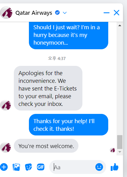11. 여기서 살짝 포기함. 아 그냥 답이 없네. 환불 받고, 비행기표는 다시 끊든지 하자.... 하던 차에 너무 아쉬운거임. 그래서 ㄱ과 ㄷ을 다시 한 번 접촉해봄. 카타르항공 페이스북 DM으로 나 너무 급하다. 이런사정인데 제발 좀 도와달라고 징징댔음. 그리고 새로 알게된 카타르항공 트위터에도 DM을 보냈음. 제발 좀 도와줘 상황이 이렇다고...