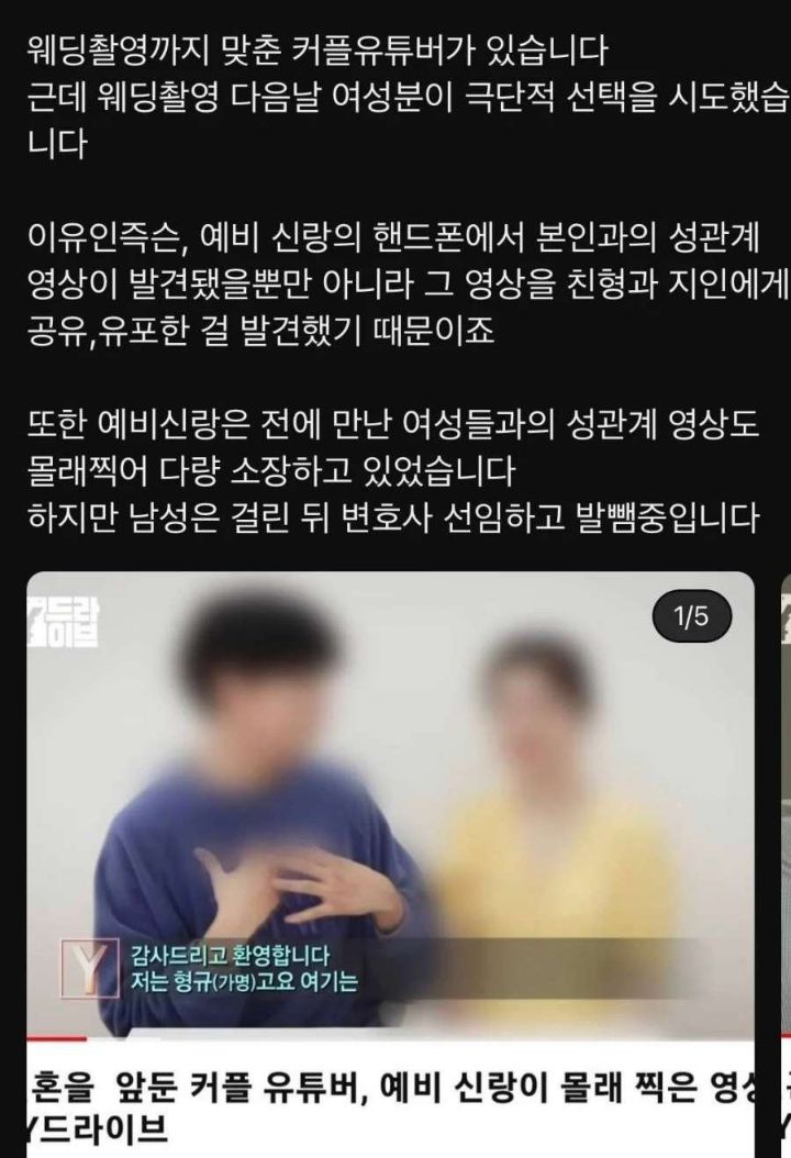 작성자DeeKeiy🎗 작성시간 23.02.05 커플 간에 합의 된 촬영이야 문제 될 게 없지만 몰래 찍어서 그걸 형제, 친구와 공유하는건 그냥 미친변태놈이네요.