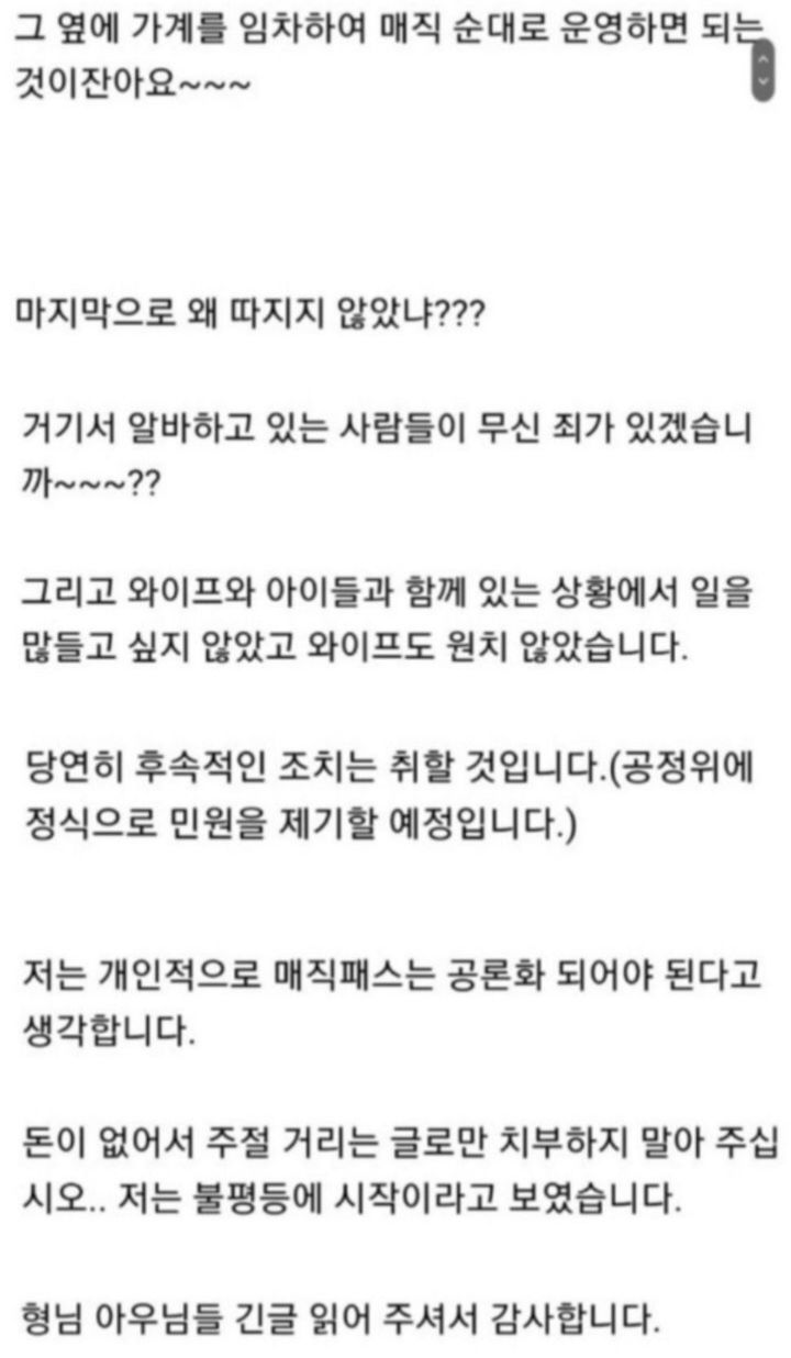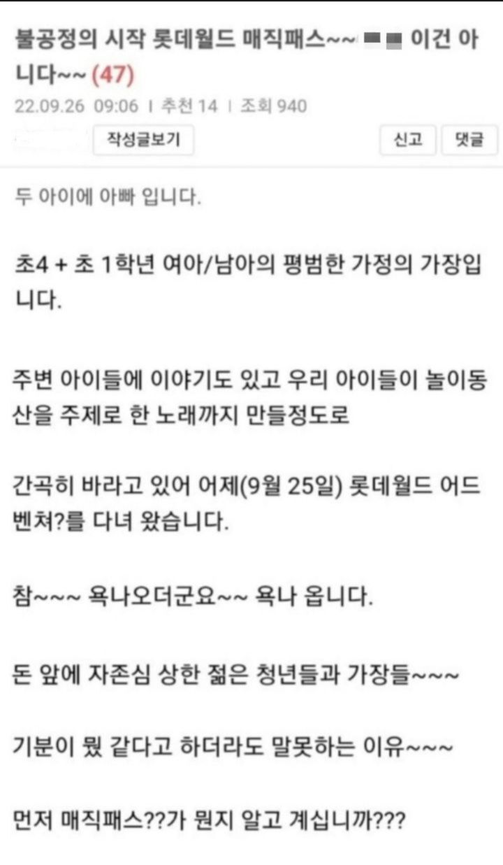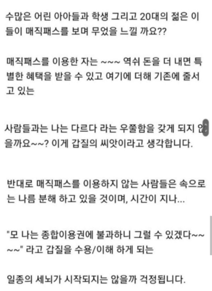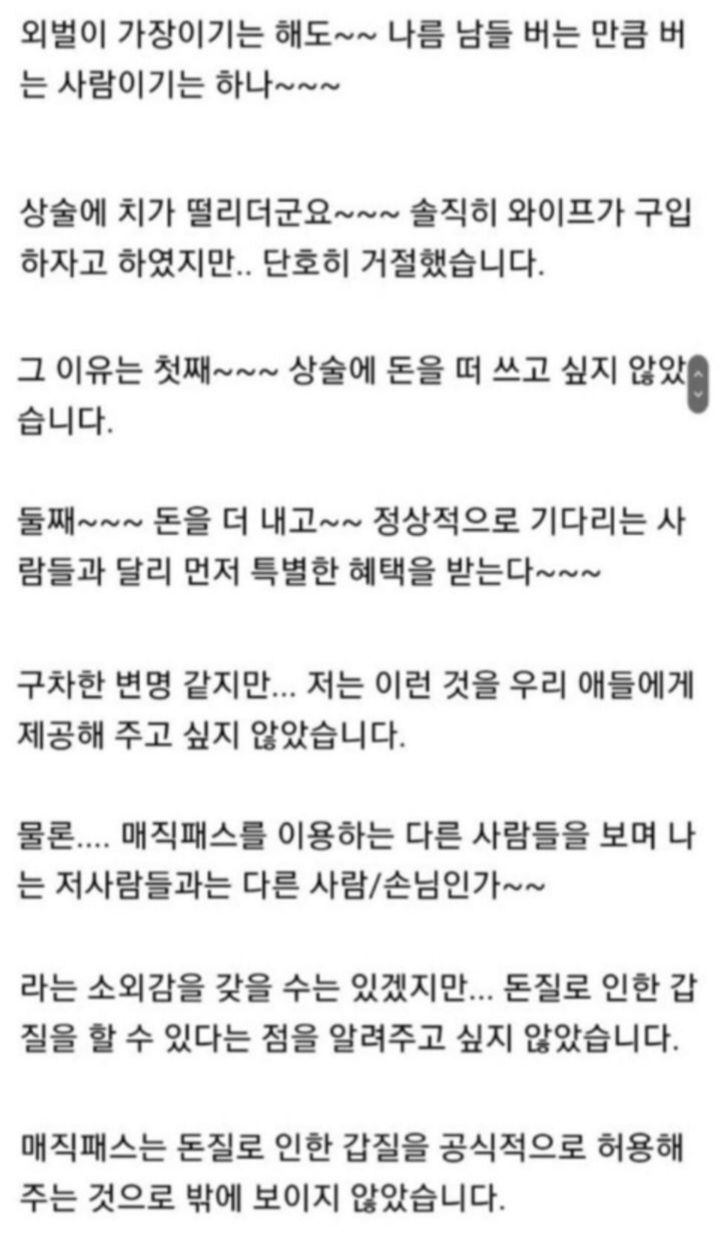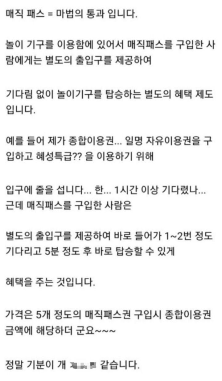 작성자클라이드 드렉슬러 작성시간 23.04.03 시간을 산다는 개념에서 합당하다고 생각되네요 만약 무조건 자유이용권이용자는 매직패스를 1개이상 사야한다라고 하면 또 이야기가 다르겠지만 시간 과 비용중 우선순위를 선택할수 있게 한측면에선 문제가 될게없다고 봅니다.