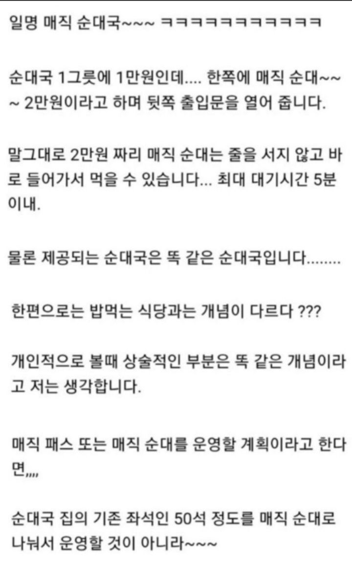 근데 순대국은 좀 다를거 같네요 테이블 회전률도 그렇고 하루 판매 갯수가 있으니.. 놀이기구처럼 1회 정해진 시간이 있다면 모를까 -