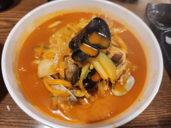 제가 소개해드렸던 시흥의 짬뽕에 미치다 라는 집과 맛이 비슷한 결입니다. 갓 볶은건 당연한거고 잘게 썬 채소, 선동오징어, 그리고 조개랑 목이버섯도 좀 있는 시원하고 깔끔한 국물입니다.
