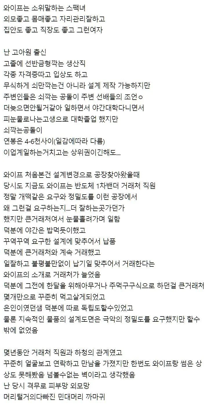 제대 후 만나게된 와이프는 나이는 동갑에 당시 대기업 직원에 외모마저 출중한 외동 딸..