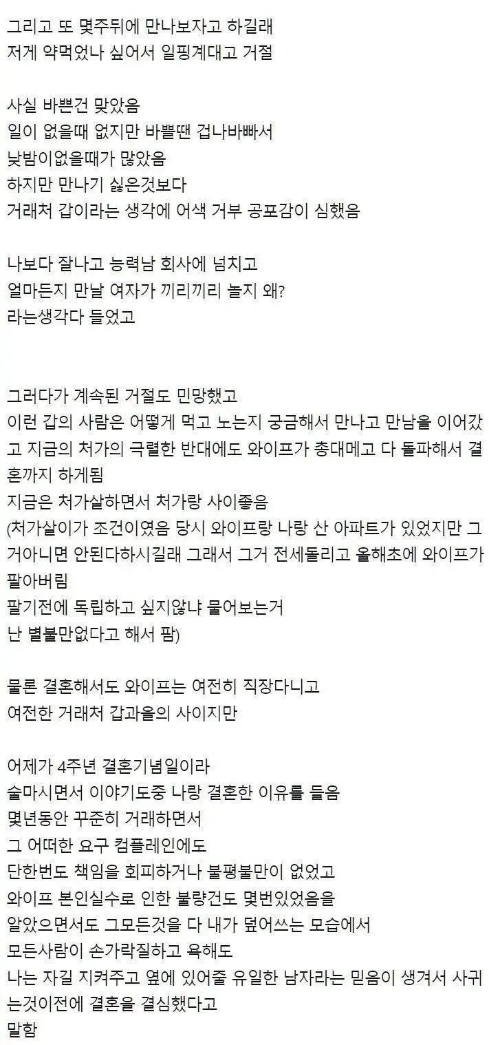 4년 연애 후 중소 기업에 취업해서 청혼 하였고 결혼 후에 이유를 듣게 되었는데..