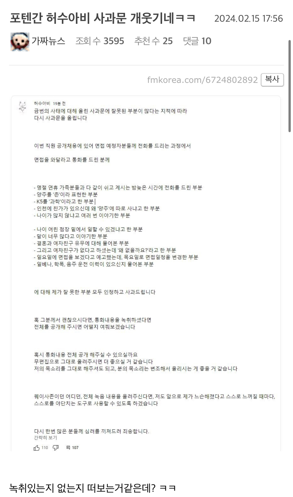 작성자호나섹 장 작성시간 24.02.16 영상 우연히 떠서 보고 나름 열심히 사시는구나 했었는데 실망스럽네요