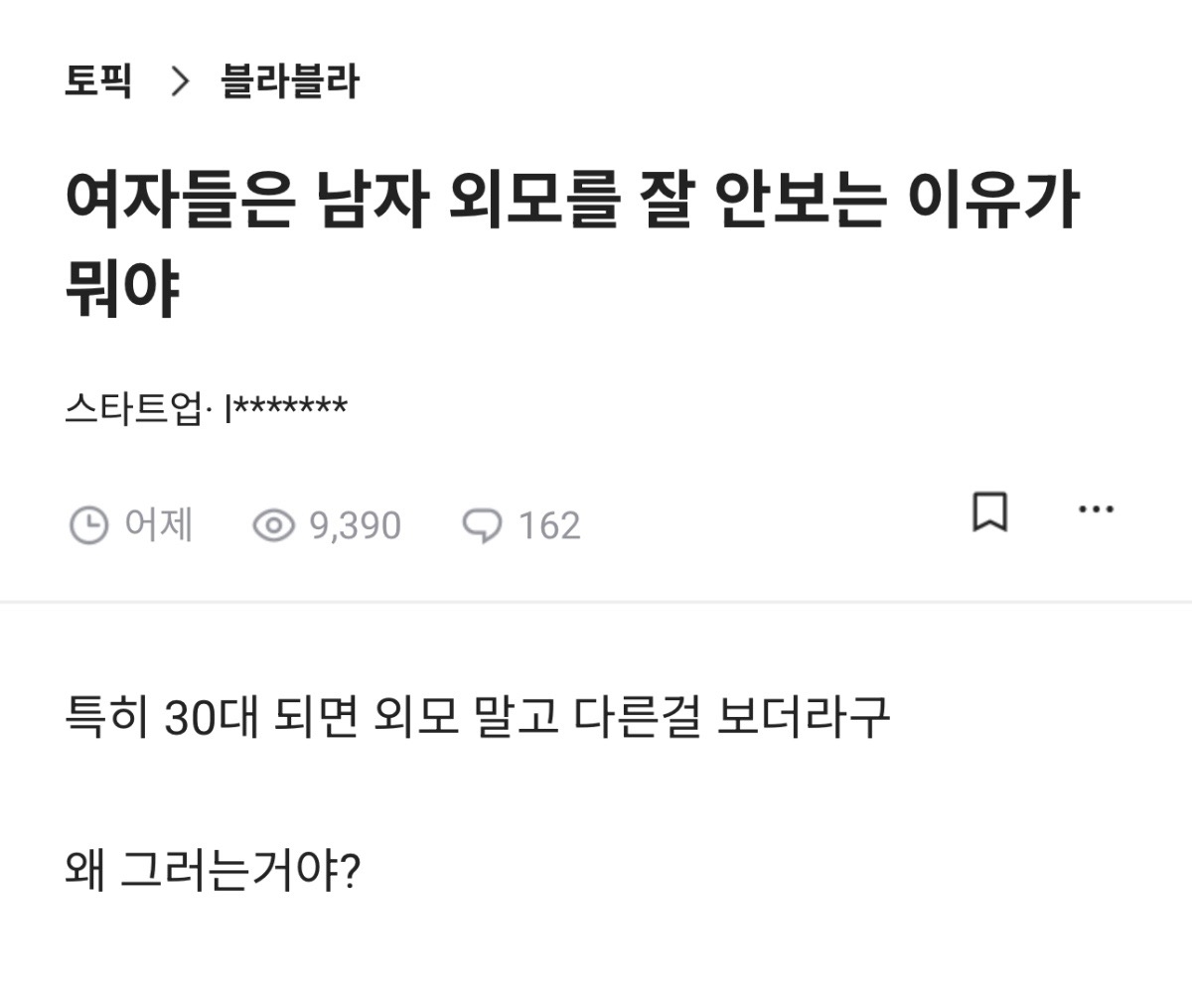 작성자[NSNL]Quin Snyder 작성시간 24.03.09 잘생기고 돈 많은 남자는 대부분 여자들도 자기한테 해당사항이 없단걸 아니까 현실적으로 경제력있는 남자를 더 우선으로 두는것뿐 얼굴 안본단건 거짓말입니다