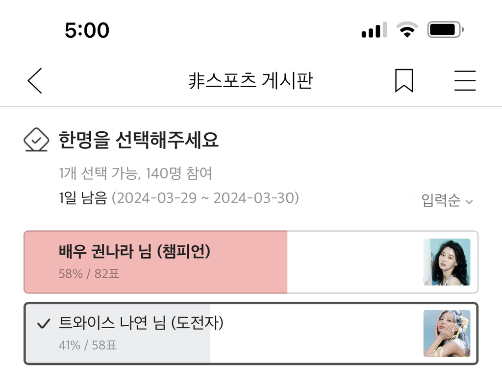 [23/24 인시즌컵] (챔) 권나라 vs 나연(트와이스) 결과 발표 (투표글 아님) - 공지 : 주말 투표 쉽니다