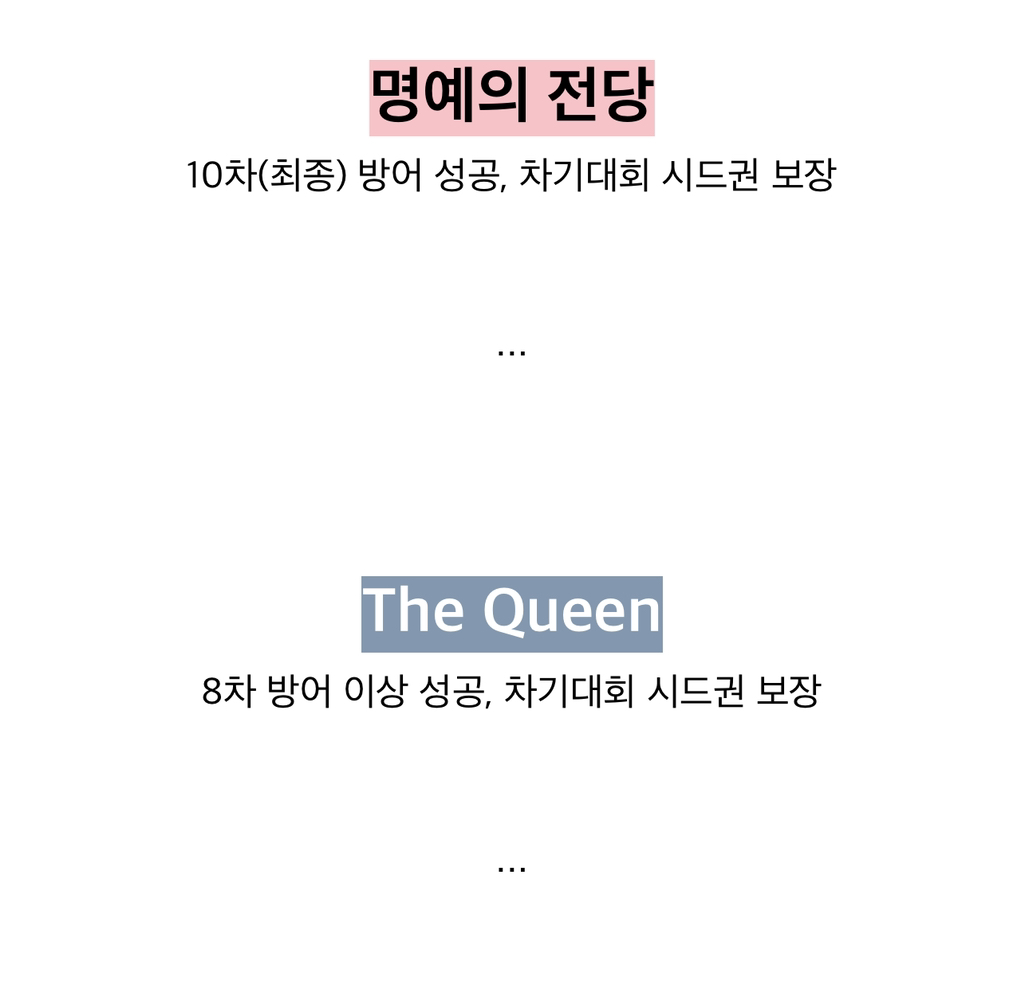5. 챔피언은 8차 방어 이상 성공시 The Queen으로 승격,