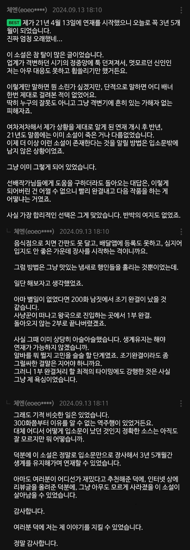 187만이라는 뷰수가 어느정도인지 정확하게는 모르겠습니다. 대충 제 선작들 몇개 찾아보니깐, 시한부 천재가 살아남는 법이 2,208만, 게임 속 바바리안으로 살아남기가 8,771만인거 보면, 초대박 작품은 택도 없고 그럭저럭 입에 풀칠만 한 정도? 아닐까 싶네요. 그러니깐 대중적으로 흥한 작품은 아니고 보는 사람만 열심히 보는 소설 이였을것 같습니다.