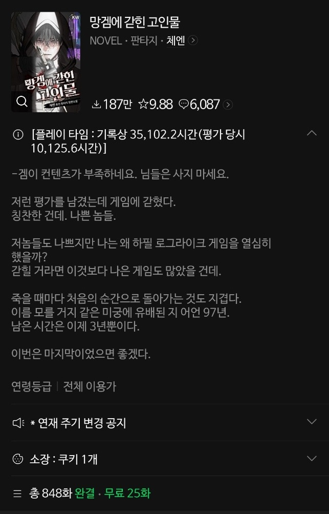 하지만 우리에겐 무료연재분이 있지 않습니까? 25화 까지 보시고 재미없음 접으면 그만이지요ㅋ 웹소설 좋아하시는 분들은 한번 읽어보시는걸 추천합니다. 개인적으로는 (정상적으로 연재되는) 겜바바와 동급으로 재미있게 봤습니다.