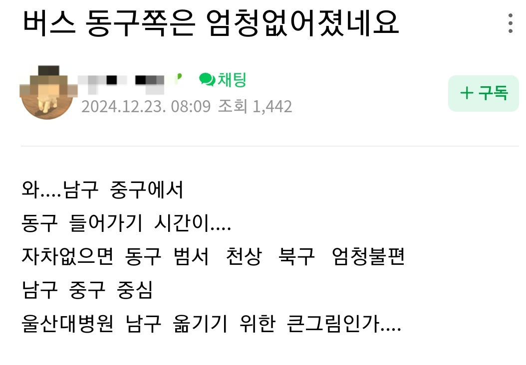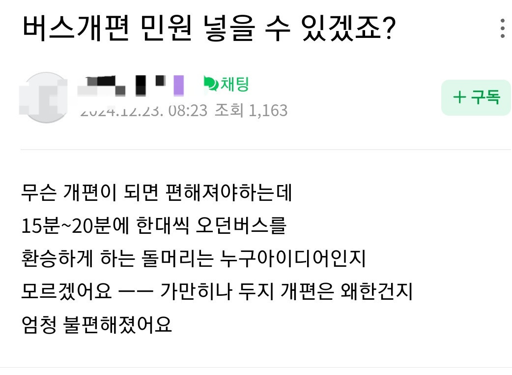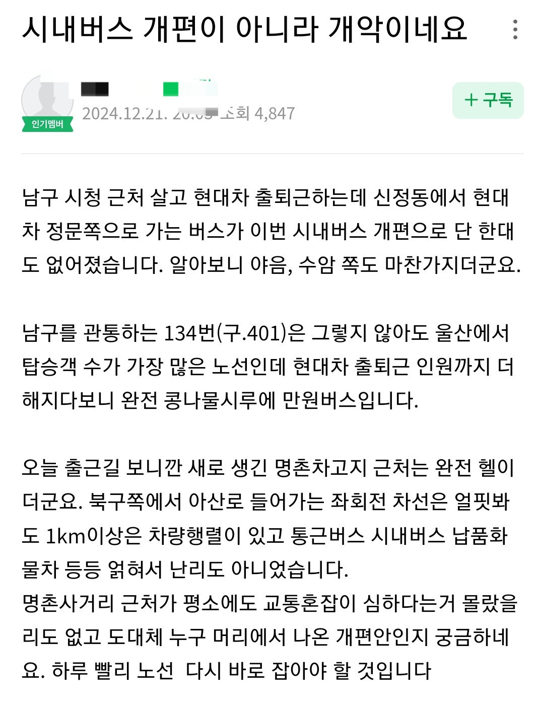 답댓글 작성자네이트 작성시간 24.12.25 이번 버스노선개편 최종승인은 김두겸이했지만 그걸 주도한건 버스택시과 김주무관과 육과장 이 둘입니다. 적어도 버스노선개편에 한해선 이둘을 비판해되는게 맞고요. 김두겸시장은 쓸데없는 치적쌓기에 급급한나머지 문수축구장 3층좌석교체도 파란색에서 빨간색 그라데이션으로 바꿀려다가 울산팬들 거센항의에 안하고 버티는중입니다. 그러면서 야구장에 유스호스텔짓는다고 하고.. 전엔 기업인 흉상건립하려다 접은적도 있고 여러모로 참 답답합니다..