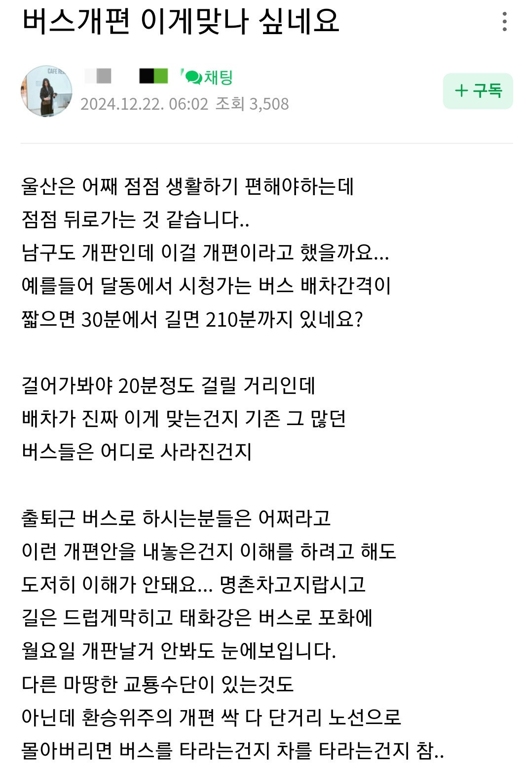작성자네이트 작성시간 24.12.25 울산 북구에 사는데 더 불편해졌어요. 저게 노선개편첫날 보도이고 그다음날부터는 아예 다른내용으로 나오는데 https://youtu.be/u1IjUrebWYk?si=FN6jsBvo3Xf9bgFG