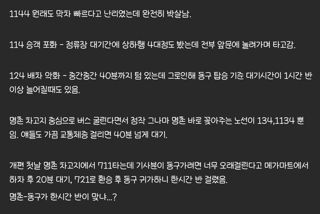 이런일도 있었다고 합니다. 노선을 바꾼건 그렇다쳐도 번호까지 바꿨음 기존노선번호라도 병행해서 부착해야 혼란이 덜할텐데 가장 기본적인거 조차 안했다는거랑 외곽지역 직행좌석노선 만들어놓고 사람이 많이 타는정류장은 패싱하고 빙빙 돌아가 지나가니 누가 탈려하겠습니까? 울산시 버스택시과 분들 여태까지 소폭이라도 노선개편 안하고 시간표만 주구장창 바꾸더니 결국 이 사단이 났네요. 당분간 이런불편은 계속될걸로 보입니다.