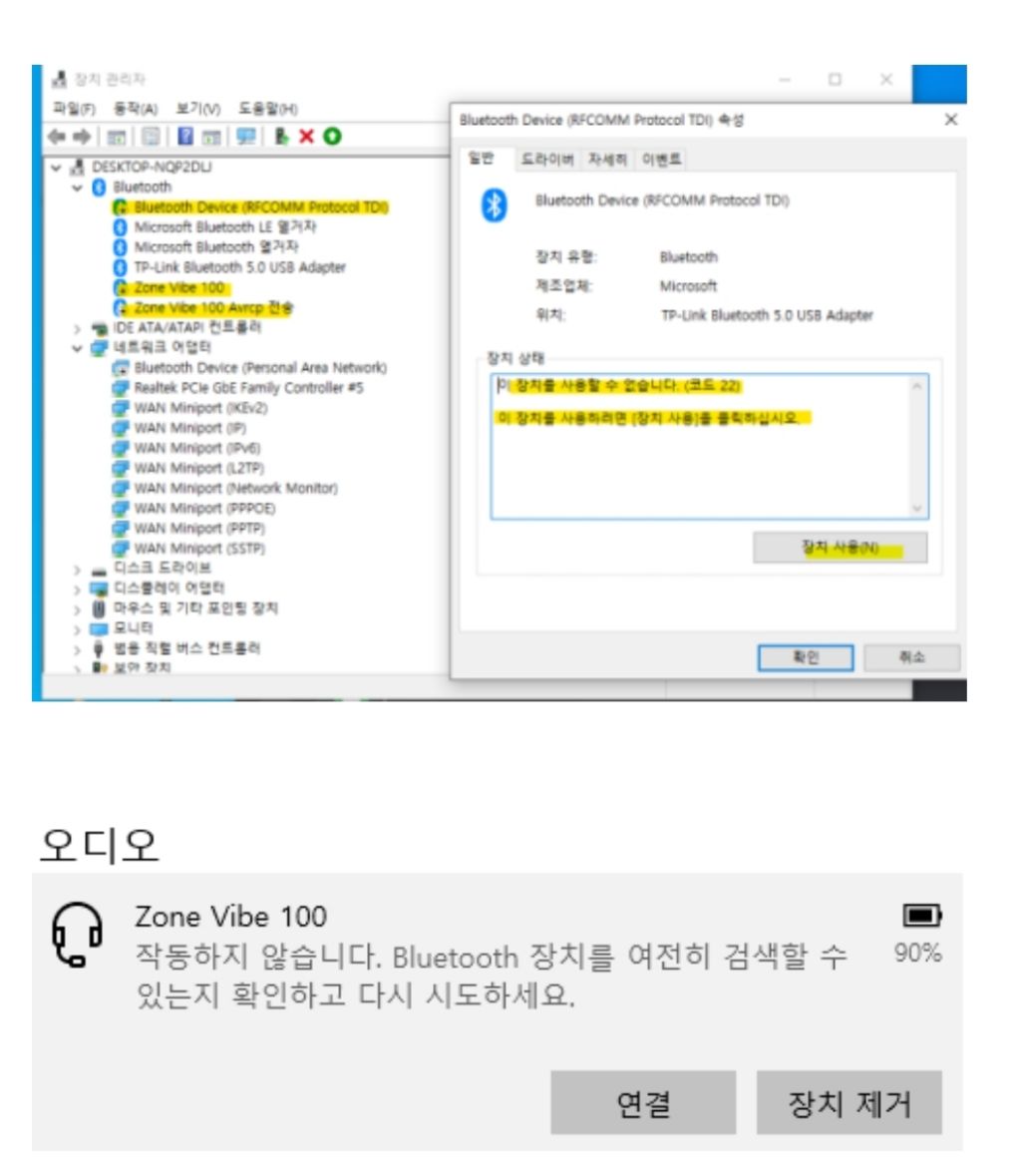 pc질문(블루투스 관련 코드 22 오류) 작성자인천무브먼트|작성시간25.01.24|조회수260 목록 댓글 1 글자크기 작게가 글자크기 크게가 다른 사람 상황이긴 한데 똑같은 상황이거든요pc에 동글이 연결하니 저런식으로 되서 안되는데버즈 2연결도 연결은 되나 같은 코드 22로 오류로안되네요 해결 방법이 있을까요 다음검색 현재 게시글 추가 기능 열기 북마크 공유하기 신고 센터로 신고 댓글 댓글 1 댓글쓰기 답글쓰기 댓글 리스트 작성자불타는 똥꾸 | 작성시간 25.01.24 드라이버 롤백장치제거재시작이 방법 써보세용 댓글 전체보기