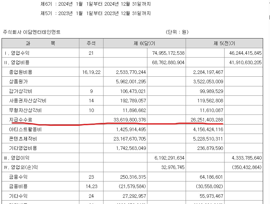 엔터사의 지급수수료는 아티스트한테 배분하는 금액으로 보여서