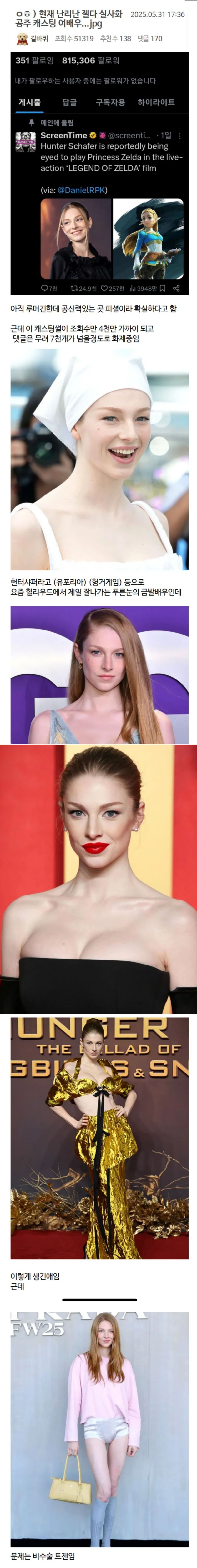 젤다의 전설 실사화 공주 캐스팅 작성자작성자|작성시간25.06.02|조회수2,289 목록 댓글 23 글자크기 작게가 글자크기 크게가 준 오피셜 급이라는 말이 있는데 현재 젤다의 전설 실사화의 공주역으로 유망한 배우라고 합니다.의외로 흑어공주나 흑설공주보다 괜찮다는 평이 있기도...혹자는 이상형이었는데 진짜 형이었다고 ㅋㅋㅋ 다음검색 현재 게시글 추가 기능 열기 북마크 공유하기 신고 센터로 신고 댓글 댓글 23 댓글쓰기 답글쓰기 댓글 리스트 작성자converge | 작성시간 25.06.02 아놔.. 작성자Lew alcindor | 작성시간 25.06.02 아... 저기.. 저기.. 볼록한거 맞죠? 아.. 작성자the rod-no.1 | 작성시간 25.06.02 와...아? 작성자cicwin | 작성시간 25.06.02 와 아무리 피시피씨 거리지만 이건 진짜 못참겟네요.. 역겹습니다... 작성자[NSNL]Quin Snyder | 작성시간 25.06.02 멸망 댓글 전체보기
