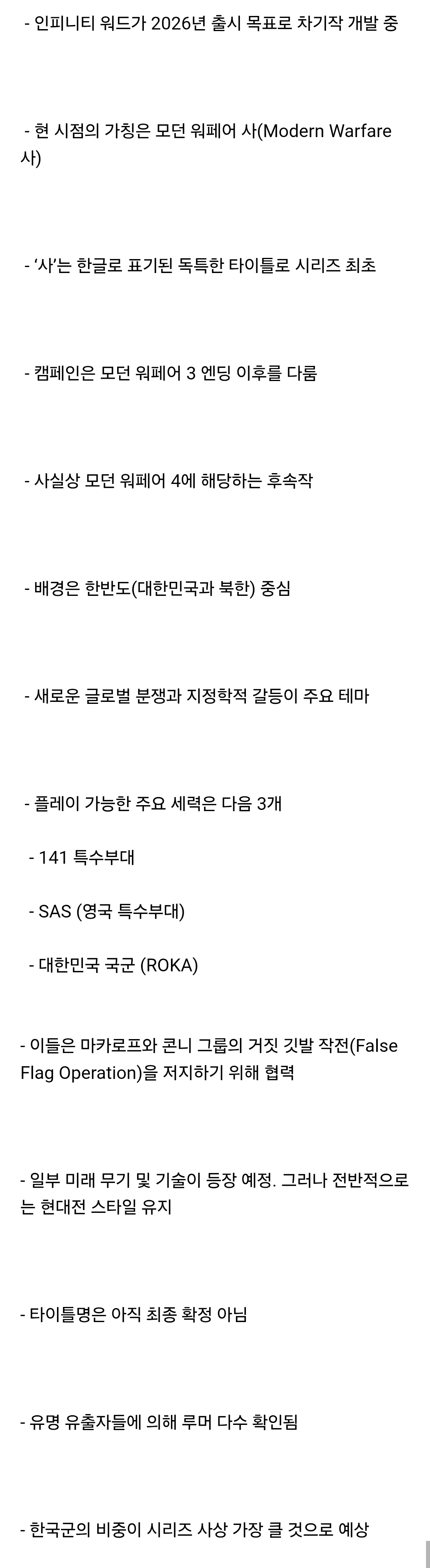 [스크랩] 콜오브듀티 차기작은 한국 현대 전쟁을 다룰것 작성자태섭|작성시간25.06.05|조회수1,544 목록 댓글 28 글자크기 작게가 글자크기 크게가 다음검색 스크랩 원문 : 이종격투기 현재 게시글 추가 기능 열기 북마크 공유하기 신고 센터로 신고 댓글 댓글 28 댓글쓰기 답글쓰기 댓글 리스트 답댓글 작성자MC홍댕 | 작성시간 25.06.05 한국배경이면 하지 않겠습니까?ㅎㅎㅎ 작성자Easy Shot | 작성시간 25.06.05 오오오오 작성자스팅아이즈 | 작성시간 25.06.05 땡기네 작성자the rod-no.1 | 작성시간 25.06.05 중요한건 한글 더빙...전작은 빠졌죠...고맙다 마소야...니들 저주할 일이 또 늘어날거 같아... 작성자비요뜨 | 작성시간 25.06.05 오 사볼까 댓글 전체보기