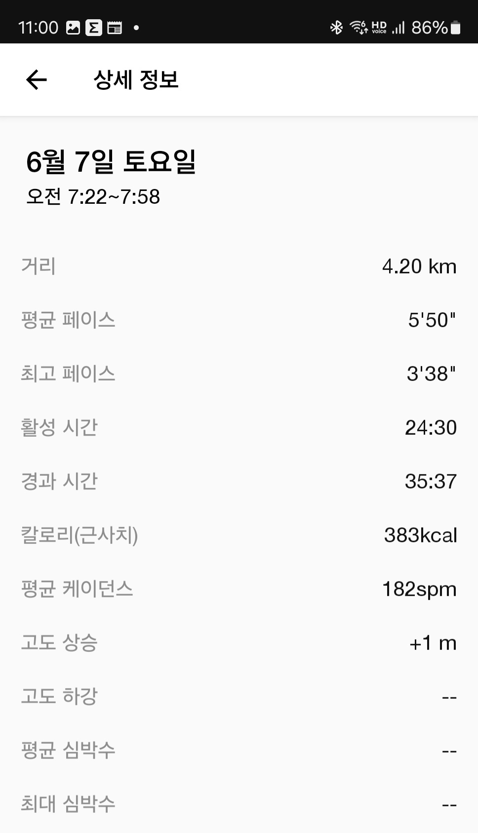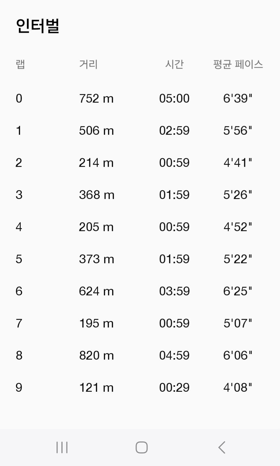 오늘 인터벌 한 기록입니다. 인터벌 직후 1분씩 40프로의 힘으로 달린 기록은 측정이 안돼 그것과 런닝 종료 후 6분 쿨다운 런까지 포함하면 한 7킬로까지는 달리지않았을까 싶네요.