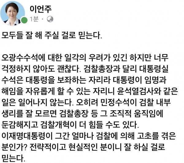 답댓글 작성자흑비 작성시간 25.06.08 당연히 핸들링 하는 관리해여하는 숫자 자체는 다르겠죠 다만 민정수석이 지금처럼 검찰 개혁이나 정치에 관심이 초집중되는 정권초기에 엇나가는 행동을 한다면 대통령이 핸들링을 못할까요 대통령를 떠나서 문재인때 실패를 맛본 국민들이기에 가만히 있지 않을거라 생각됩니다