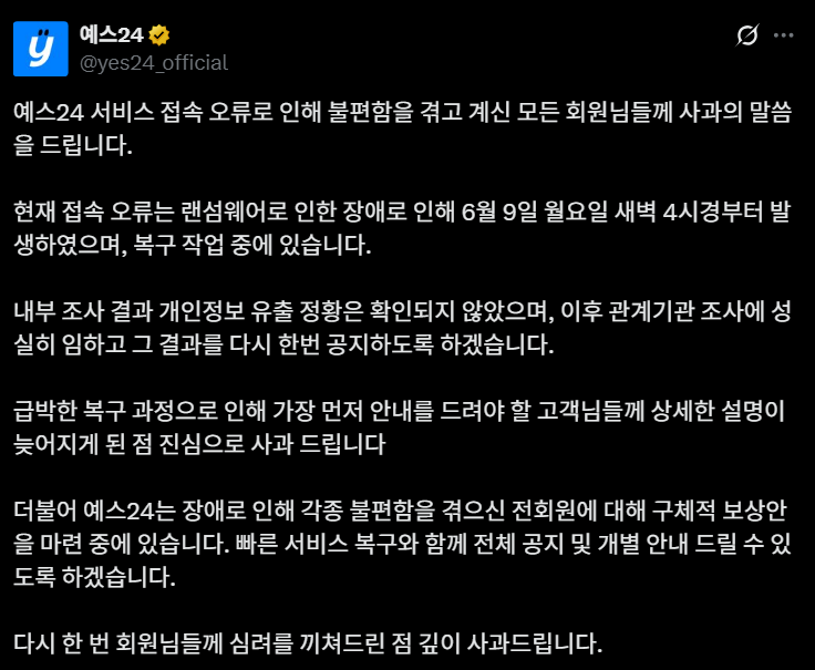 당장 yes24티켓도 문제지만 Ebook같은경우 크레마클럽 정기구독자도 많고 적게는 수십권에서 많게는 수천권 보유한 사람들 있는데 복구못해서 집단소송으로가면 타격이 상당할듯