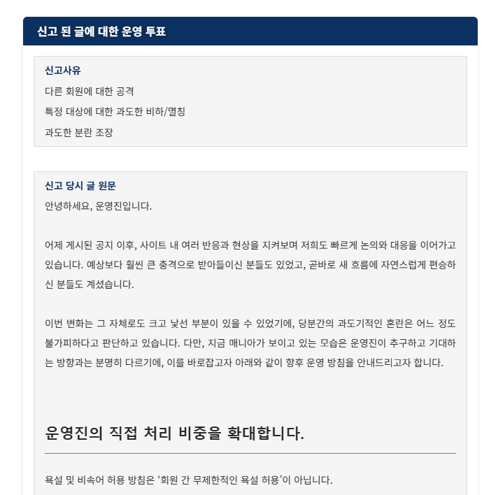 운영진이 올린 공지글도 회원들이 신고하고 완전 난리도 아니네요...